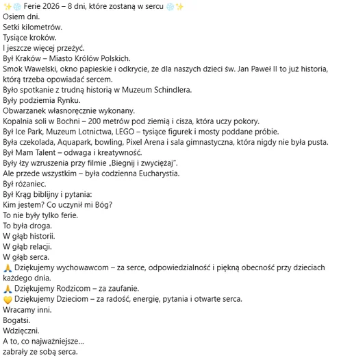 Z całego serca dziękujemy wszystkim, którzy wsparli ten wyjazd — rodzicom za zaufanie, opiekunom za troskę i obecność, a także wszystkim, którzy modlitwą i dobrym słowem pomogli, by ten dzień mógł się wydarzyć.